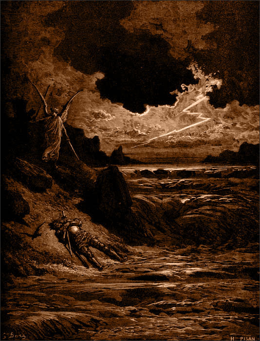 Buonconte da Montefeltro, like his father, was a “man of arms.” While Guido reached that part of life “where every man should lower the sails and coil the ropes,” (Inf. 27.80) however, Buonconte was not so lucky, and suffered a mortal wound in the battle at Campaldino. His body was never found, and the story he recounts to Dante explains both his salvation and the cause for his body’s disappearance. Upon being wounded, says Buonconte, “I made my way / wounded in the throat, fleeing on foot, / and dripping blood across the plain” (Purg. 5.97-99). This graphic image emphasizes the violent nature of his death. While Buonconte’s struggle from the battlefield is filled with blood and gore, the moment of death itself is one of repentance and clarity. “There I lost sight and speech. / I ended on the name of Mary…” (Purg. 5.100-101) In losing his sensory faculties, those of sight and speech, Buonconte becomes, in a sense, a living spirit. Since he has no way of perceiving the physical world, for a moment he is purely an internal being. He ends his life on the name of Mary, only the second word of the traditional Catholic prayer. These two words, however, are enough. They signify his genuine remorse and his willful repentance. We also have to wonder why, when he is slashed in the throat, Buonconte does not simply lie down on the dusty battlefield to die, but rather wills himself onwards, to the spring at the source of the Archiano. Perhaps this too is a representation of his desire for cleansing and redemption. Buonconte’s repentance, though tardy, is what saves him from his father’s fate. As in the case of his father, angel and demon alike fight for Buonconte’s soul. When Guido dies, St. Francis comes for his soul, only to be stopped by a black cherubim who claims the soul for hell instead. Similarly, while Buonconte’s spirit is taken by God’s angel, “he from hell” (Purg. 5.104) cries out in protest. Satan is unable to claim Buonconte’s soul, however, for Buonconte willfully repented, whereas Guido half-heartedly repents only to consciously continue to sin. It is only in choosing the good, Buonconte demonstrates, that we can ever dream of salvation. If our repentance is insincere, Guido shows us, we may as well have never repented at all.