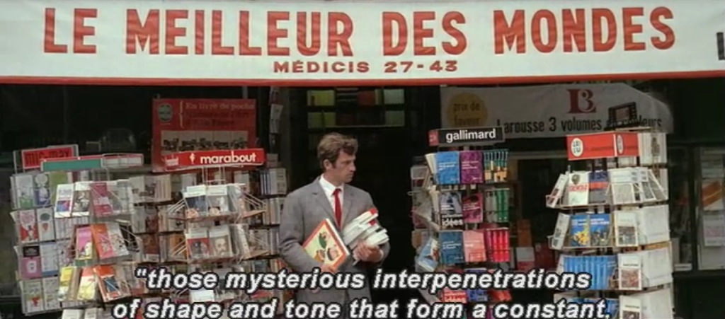 Godard paints the meaningless world and the absurd man’s struggle into images in the introductory sequence of Pierrot le fou. When the viewer is first introduced to protagonist Ferdinand, he is seen in front of a bookstore with a sign “Le Meilleur des Mondes”, or “Brave New World”. Godard’s framing of the sign is intentional, but it’s intent is at first unclear. However, Huxley’s Brave New World is an exploration of life in a dystopian future devoid of meaning. Thus Godard’s framing serves to establish Ferdinand’s disillusionment with the world around him.
