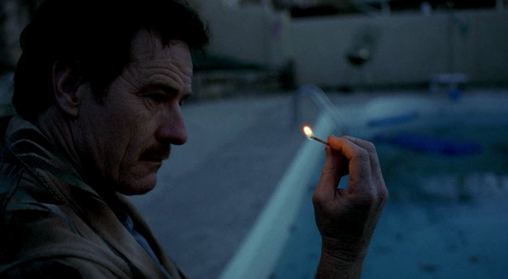 Walter Lighting Matches by the Pool (Credits: http://www.standbyformindcontrol.com/wp-content/uploads/2013/06/BreakingBadPoolPilot.jpg?9d7bd4)