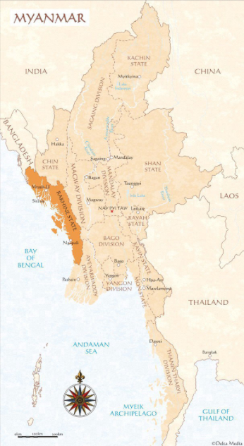 Map of Myanmar / Burma with the Arakan (otherwise known as Rakhine) state highlighted